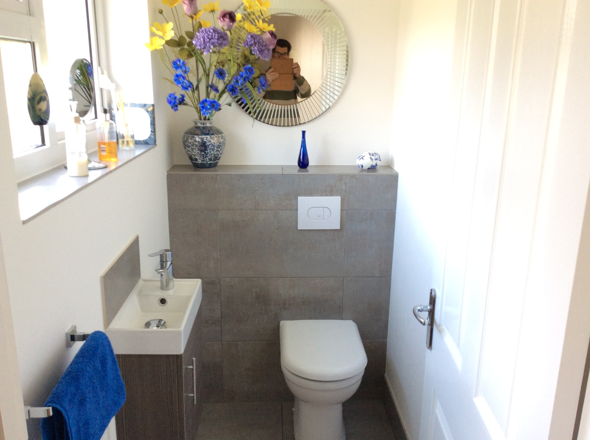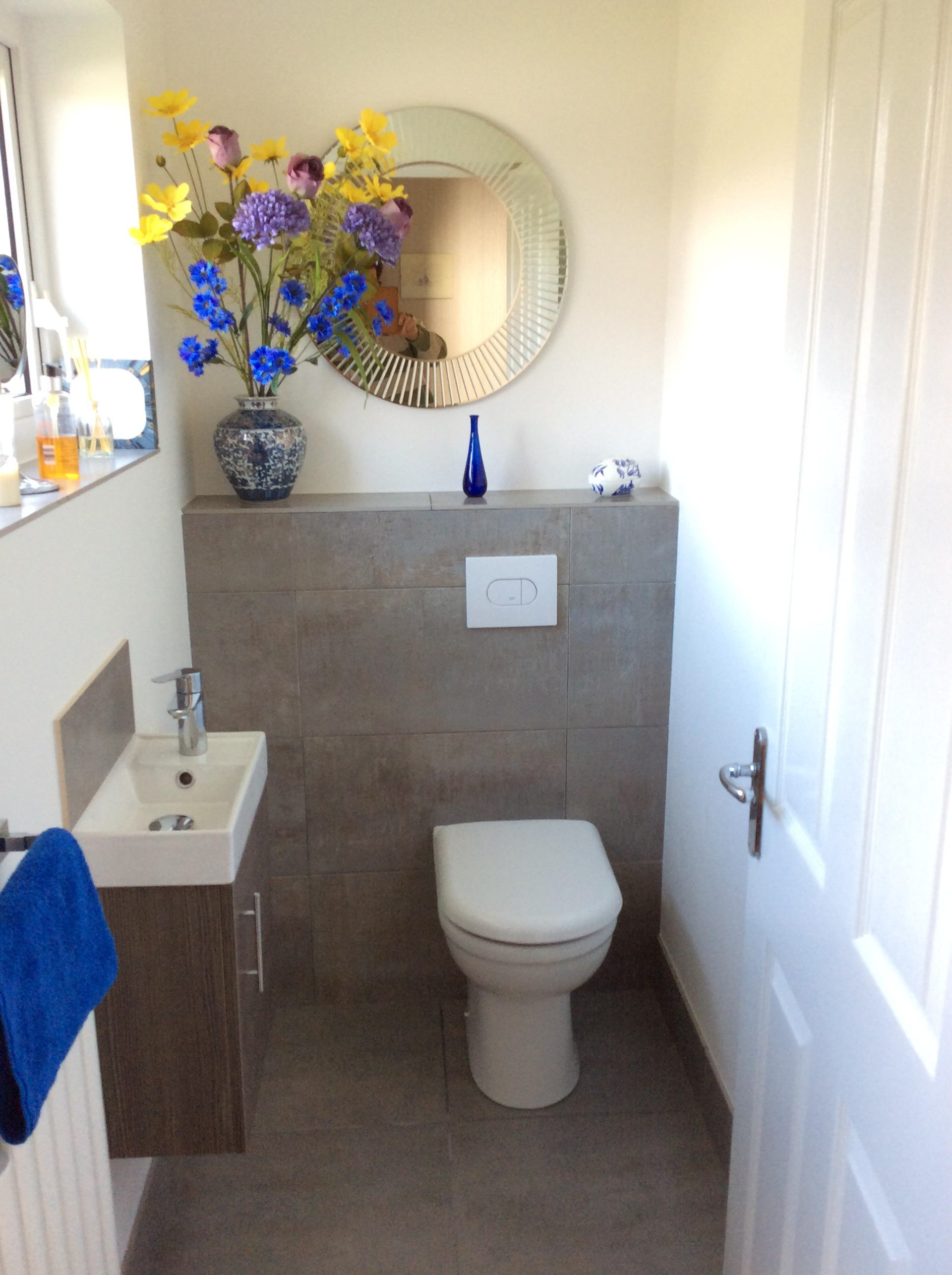 A small cloakroom in Roman Way, Bourton on the Water, with wall and floor tiles from Porcelanosa.